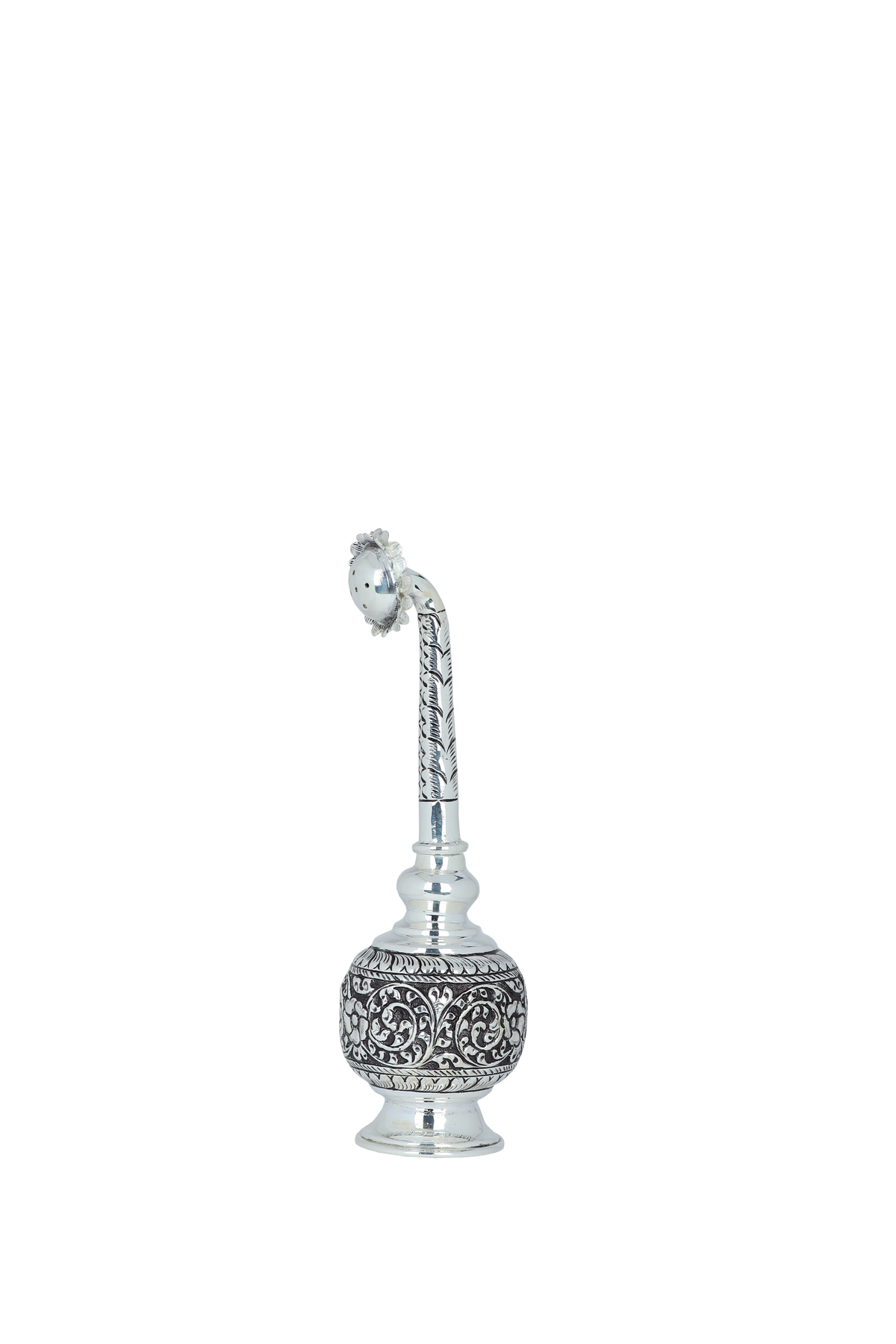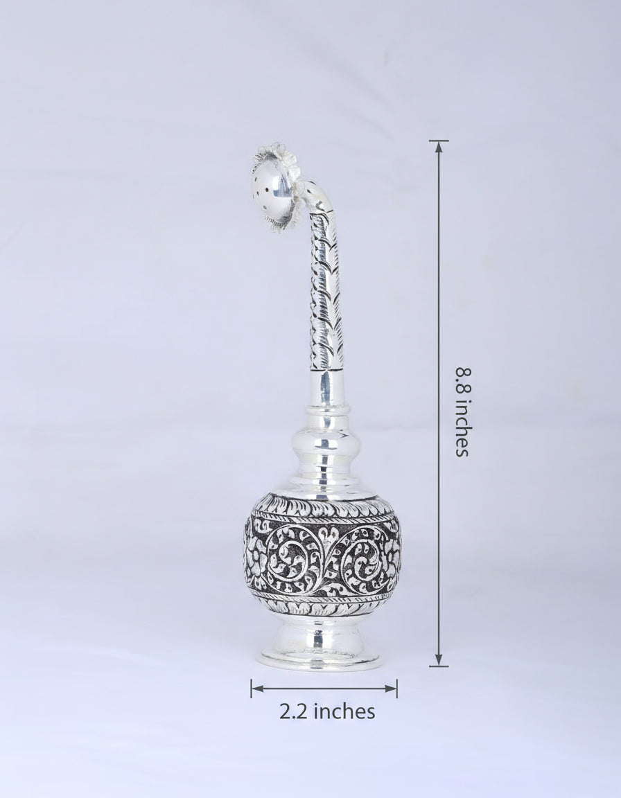 This sacred Gulab Dani features intricate hand-chased patterns in 925 pure silver with a beautifully sculpted peacock head spout. The mirror-polish finish showcases skilled traditional artistry.
