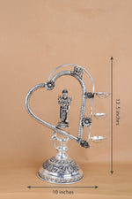 This magnificent pair of standing oil lamps represents the divine union of Radha and Krishna, embodying eternal love, devotion, and spiritual harmony in Hindu traditions. The heart-shaped framework symbolizes the "Hridaya Chakra" - the heart center where divine love resides, making these lamps powerful vessels for Bhakti (devotional worship).
