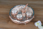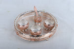 Elevate every prayer ritual with this Royal Silver-Plated Pooja Thali Set featuring a stunning 12.2-inch embossed plate and five matching pooja accessories. The three beautifully detailed bowls are perfect for holding kumkum, rice, and offerings, while the glass and ornate spoon add functional beauty. Weighing 1775 grams, this set boasts a durable, intricate design with traditional Indian floral engravings and elegant footed stands.