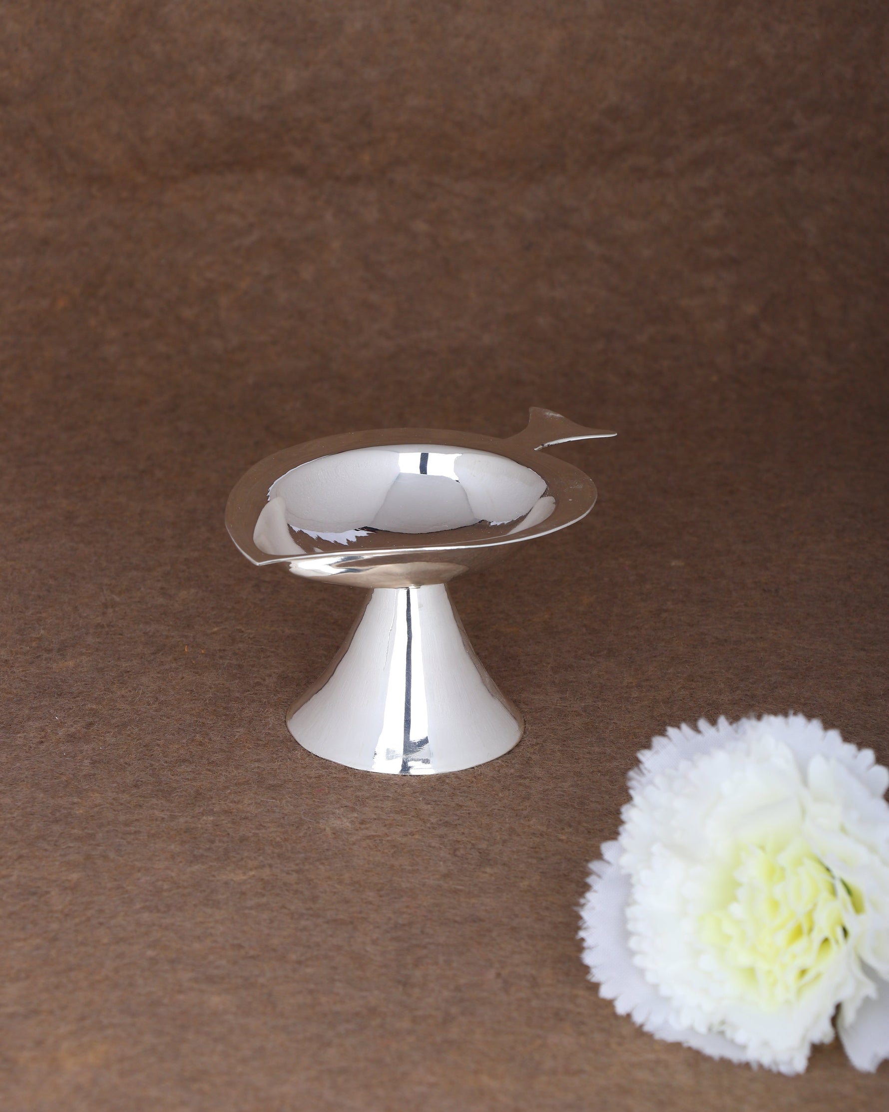 Craftsmanship: Hand-forged in classical lotus petal design with mirror-polished finish. The broad, shallow bowl features gently curved sides that taper to a central wick holder. Supported by an elegant fluted pedestal base that elevates the flame for optimal light dispersion. Interior bowl is smooth-finished for easy oil filling and maintenance.